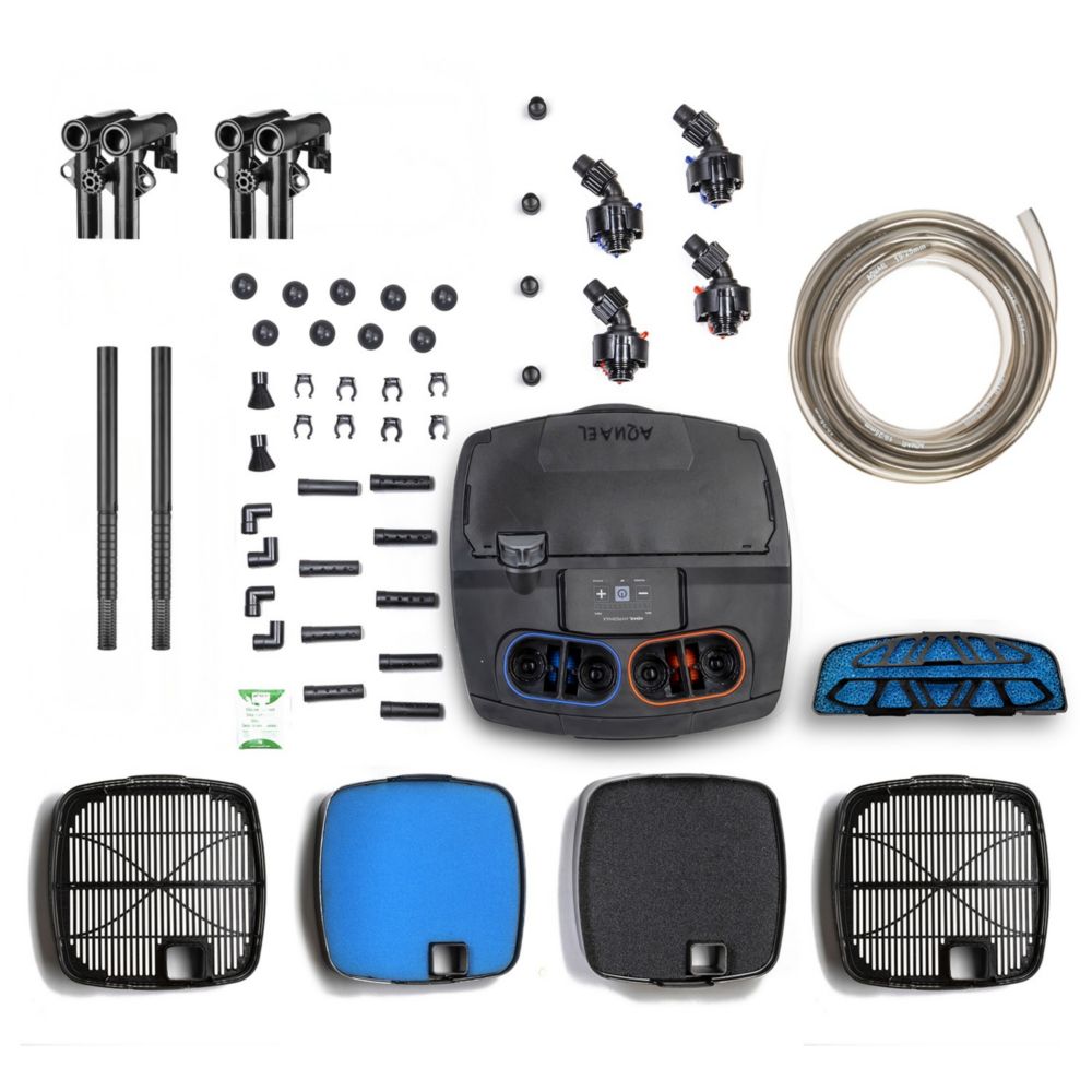Σωλήνες, αγκώνες, σωλήνες υπερχείλισης, σύστημα καταιωνιστήρων, κασέτες για καλάθια μέσων φιλτραρίσματος (σφουγγάρι προφίλτρου 10 PPI, σφουγγάρι 20 PPI, σφουγγάρι 30 PPI). Και 2 άδεια καλάθια φιλτραρίσματος που τα γεμίζετε ανάλογα με τις ανάγκες του ενυδρείου σας.