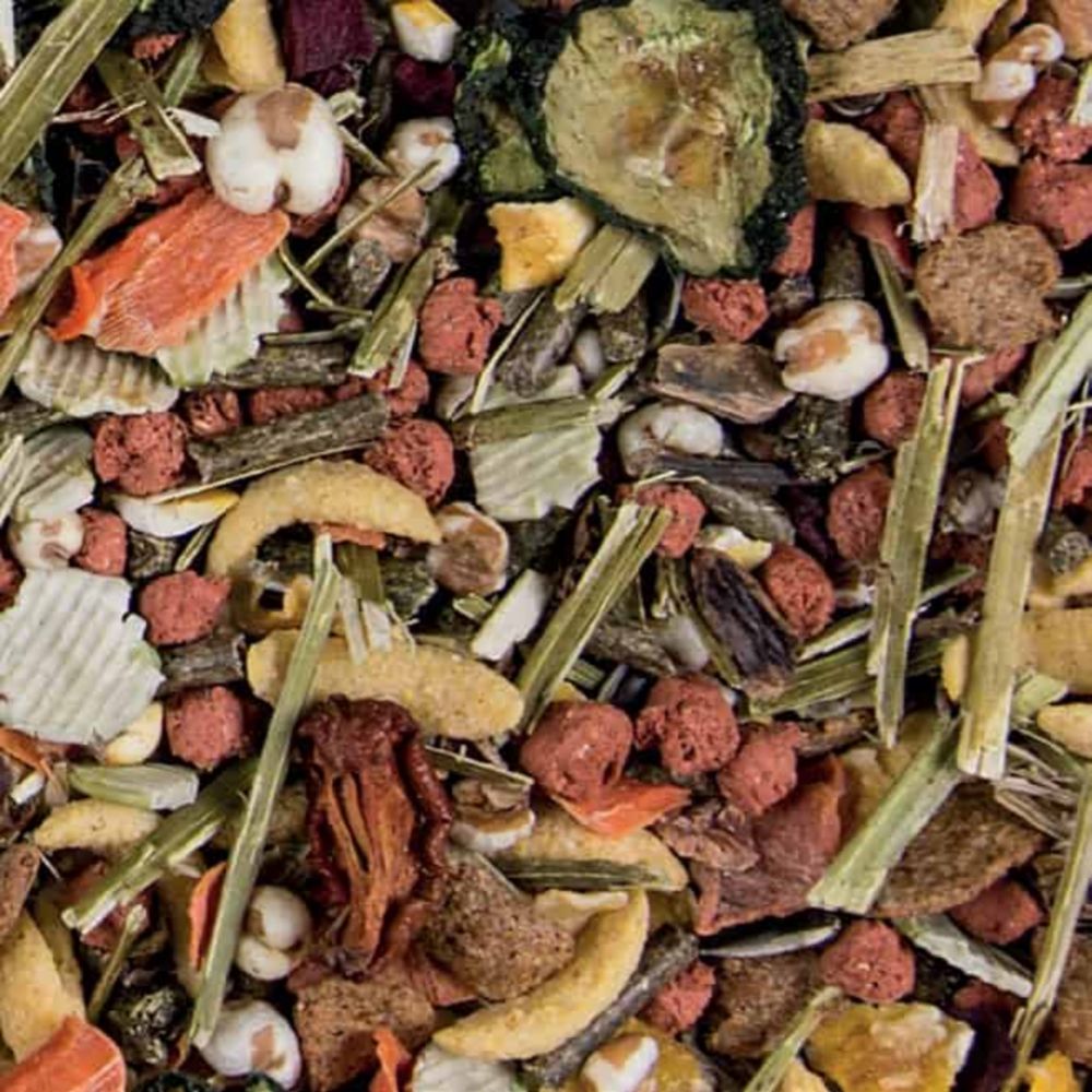 Αναλυτική Σύνθεση: χόρτο alfalfa, χαρούπι, καλαμπόκι, πίτουρο σιταριού, σόγια, μπιζέλι, pop corn, ηλιόσπορος, καρότο, βρώμη, λινάρι, μήλο, κυνόροδο (άγριο τριαντάφυλλο), κολοκύθι, ασβέστιο.